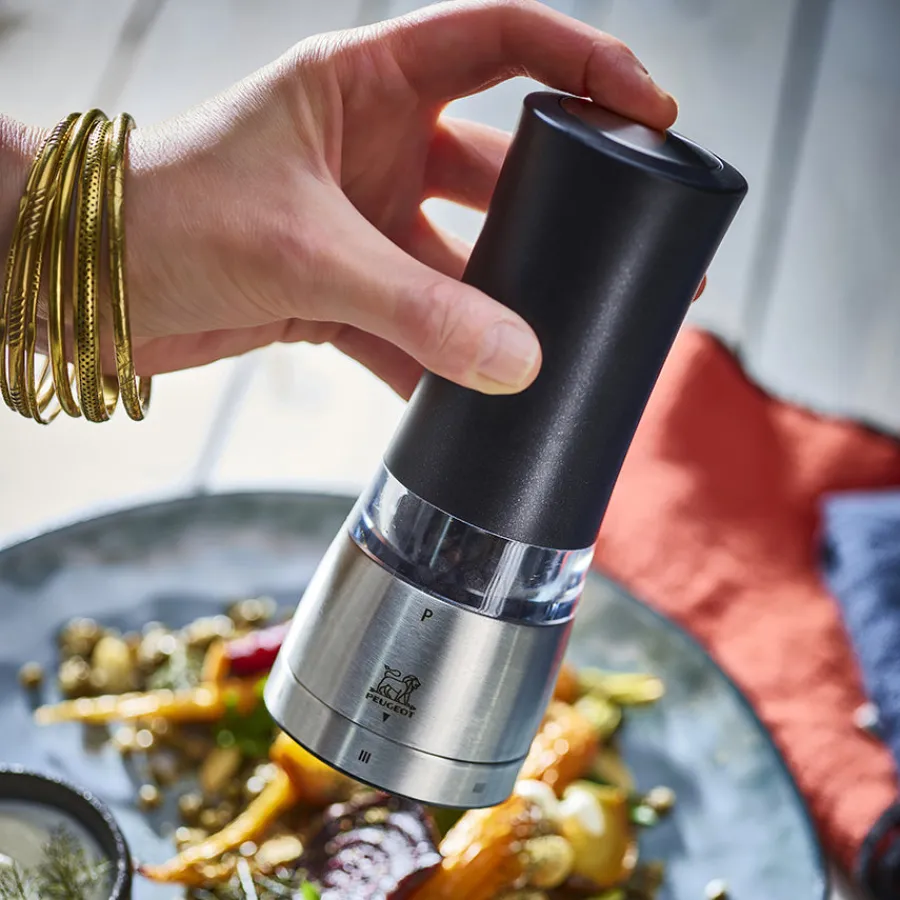 Denne elektriske pepperkvernen fra Peugeots Daman-serie måler 18 cm og gir enkel én-håndsbetjening med bare et knappetrykk. Kvernen er utstyrt med U’Select-systemet, som lar deg justere kverningsgraden med høy presisjon. Ideell for deg som ønsker kraftfri pepperkverning med nøyaktig resultat, også under matlaging.
