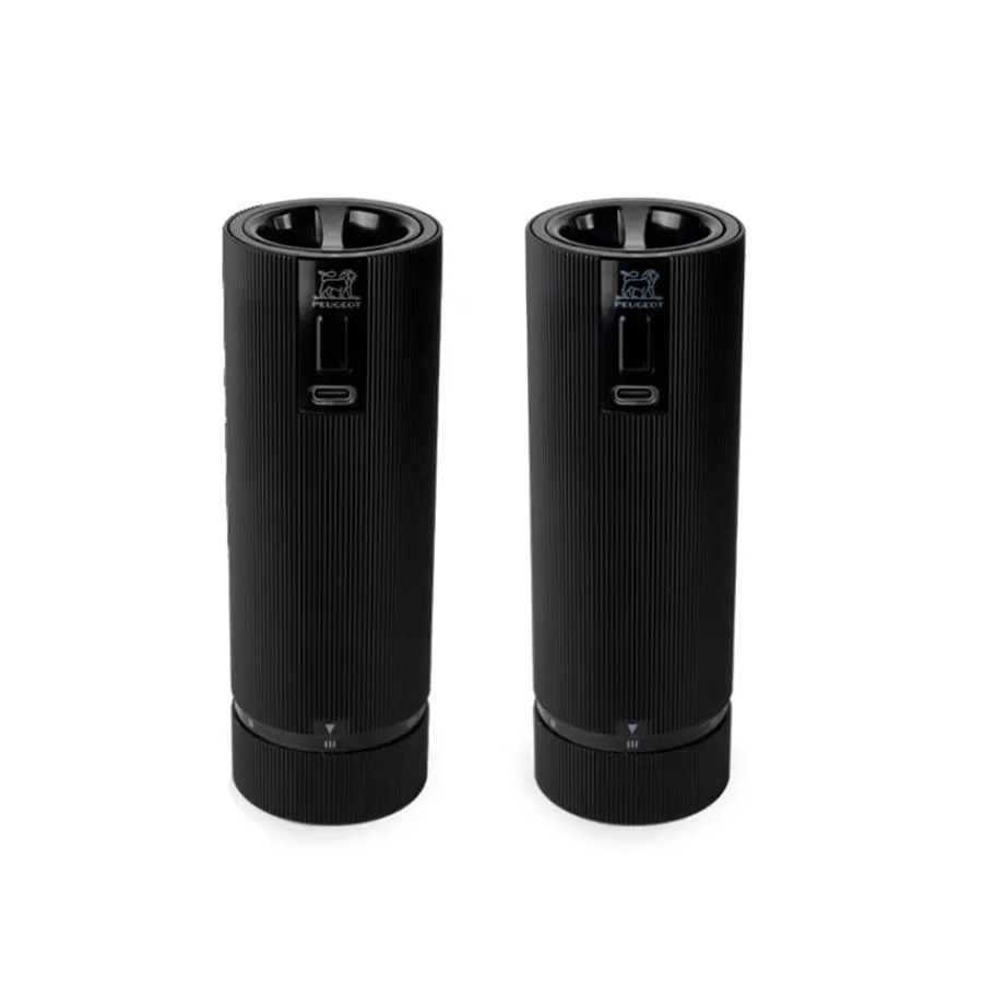 Peugeot Night er et sett med elektrisk salt- og pepperkvern, begge i matt svart finish og med høyde på 15 cm. Det stilrene designet kombineres med brukervennlig én-håndsbetjening og pålitelig kvernverk for salt og pepper. Perfekt for deg som ønsker både stil og komfort ved matlaging og servering.