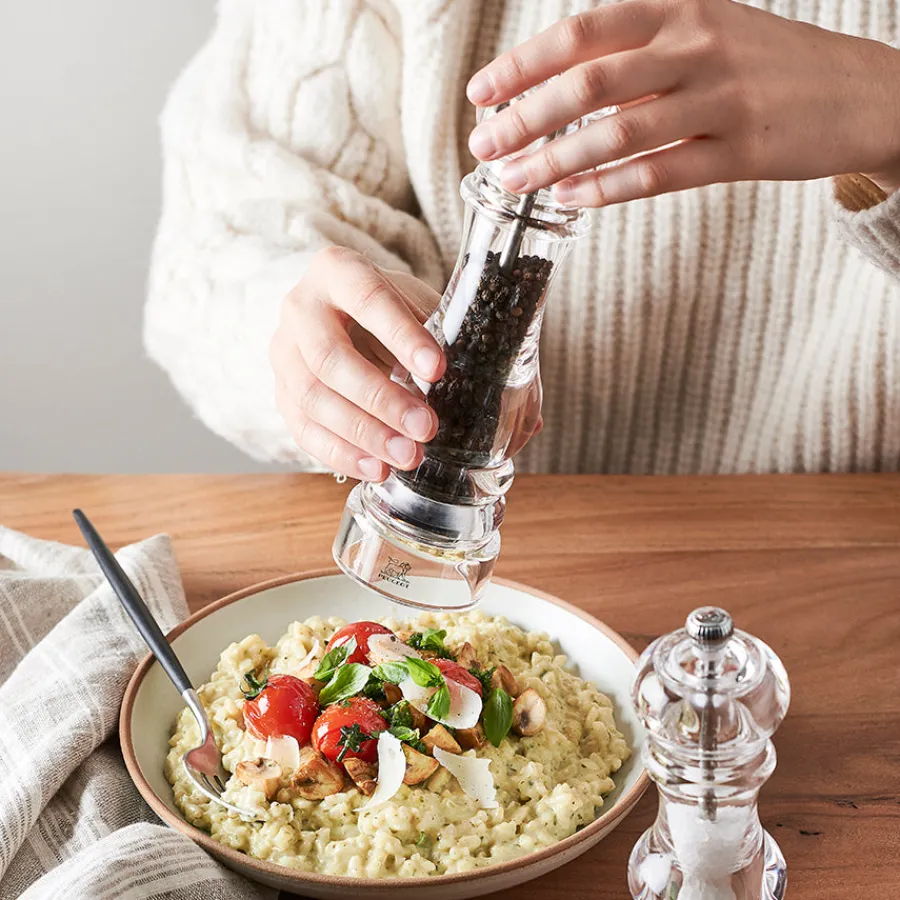 Denne høye pepperkvernen i klart akryl på 22 cm gir deg både kapasitet og synlighet. Den klassiske formen gir godt grep, og stålkvernen er effektiv og holdbar. Perfekt for deg som ønsker en kvern med profesjonell ytelse og stilrent utseende.