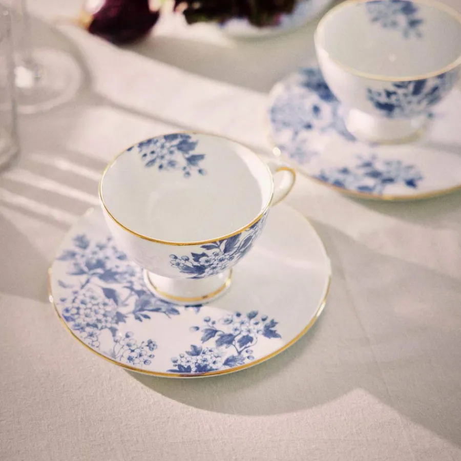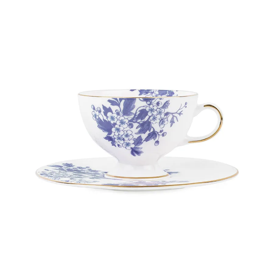Med sin elegante blåfarge og gullkant, er dette kopp- og skålsettet et stilrent valg for kaffe og te. Perfekt for rolige kaffepauser eller formelle anledninger.