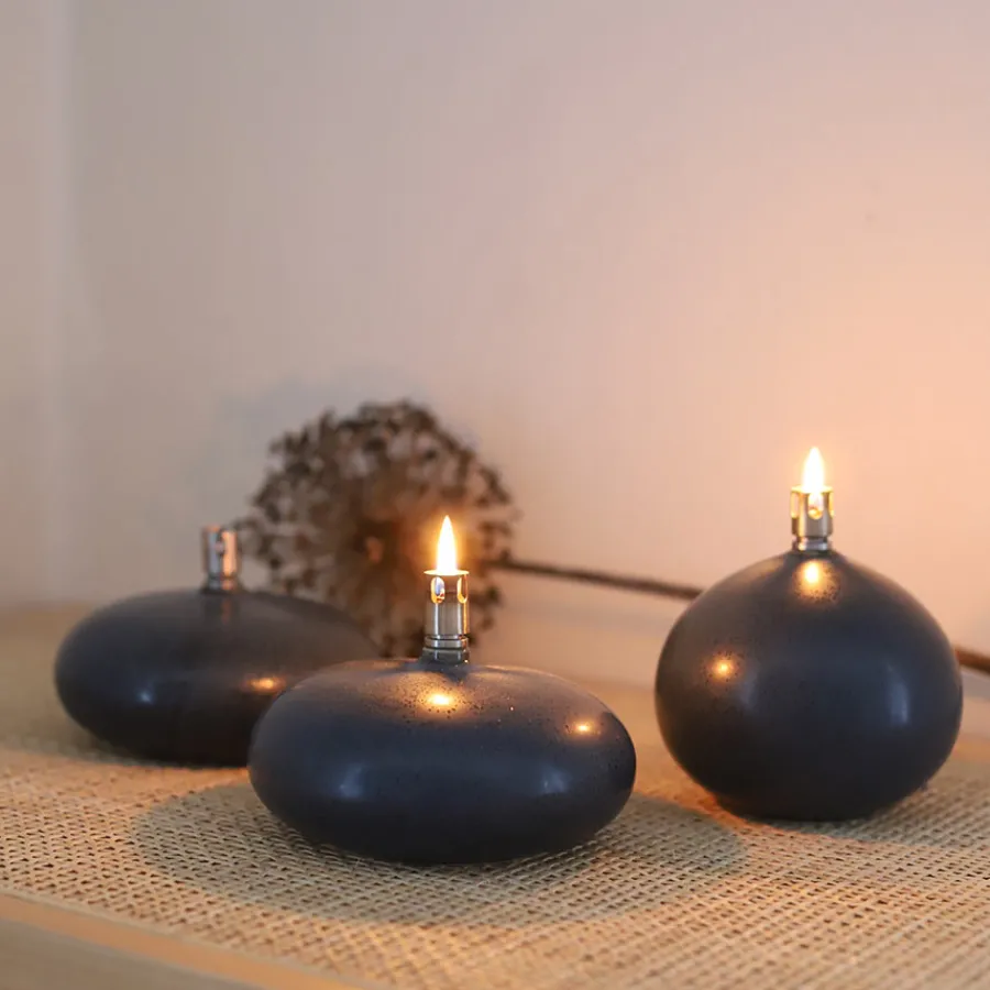 Denne mellomstore oljelampen med blå reaktiv glasur er både praktisk og dekorativ. Formen, inspirert av rullesteiner, og glasurens unike spill av farger gjør lampen til et blikkfang. Brenneren er laget av stål med glassfiberveke for stabil og trygg bruk, og lampen er CE-godkjent.