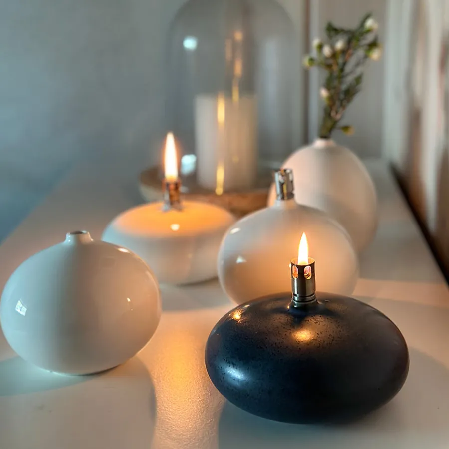 Denne oljelampen med blå reaktiv glasur kombinerer naturlig inspirasjon og kunstnerisk eleganse. Glasuren gir en unik finish som gjør hver lampe enestående. Med brenner i stål og glassfiberveke får du en trygg og jevn flamme. Lampen er CE-godkjent og passer perfekt som stemningsbelysning i hjemmet.