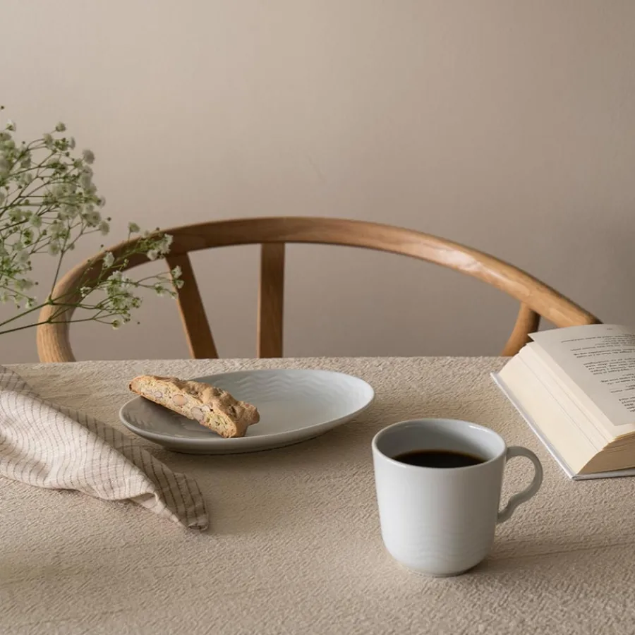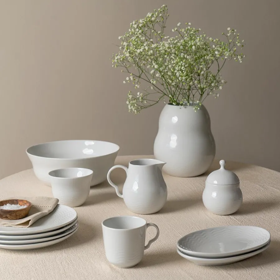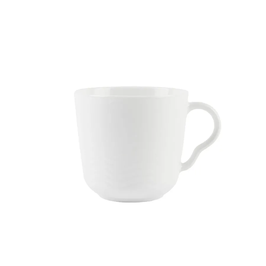 Krus fra Porsgrunds Porselænsfabrik nye servise, Bølge Hvitt. Nyt en deilig kopp med te eller varm kakao til frokost eller en frisk høstkveld fra kruset som rommer 40 cl. Bølge-serviset er inspirert av havet og selvsagt bølgene, og er utsmykket med en vakker bølgerelieff i porselenet.