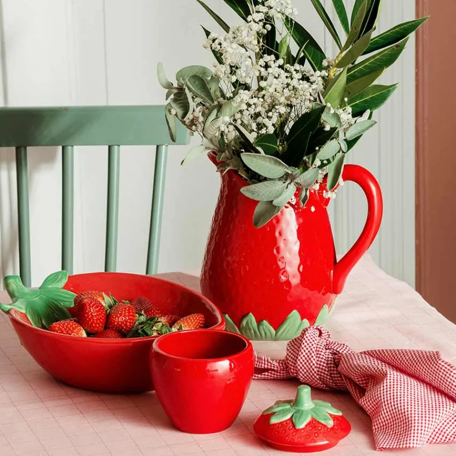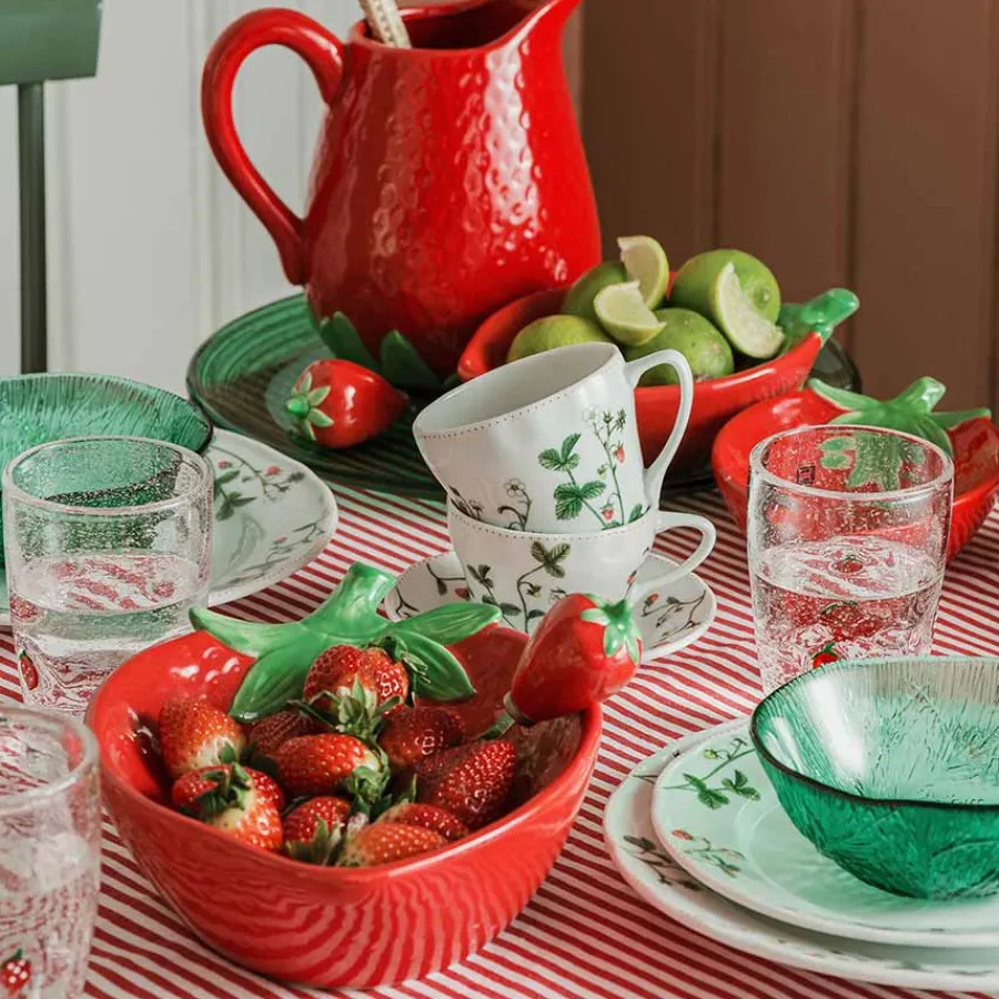 Skål i et vakkert jordbærdesign fra Porsgrunds Porselænsfabrik. Serien Jordbær er en flott samling av servisedeler som sprer friske farger og sommeridyll på bordet, perfekt til servering av friske desserter og snacks til de varme vår og sommerdagene. Jordbærskålen måler 26 cm x 19 cm.