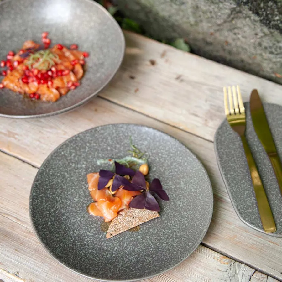 Dyp tallerken i mørk granitt fra Porsgrunds Porselænsfabrik. Porsgrund tilbyr en nordisk serie bestående av servisedeler i organiske former og ulike farger, inspirert av den flotte naturen. Den dype tallerkenen er fremstilt i mørk granitt, og passer utmerket sammen med servisedeler fra seriens ulike farger for et personlig preg på bordet.
