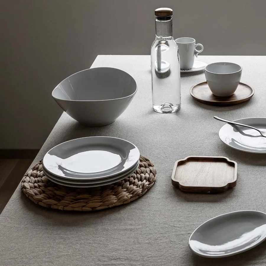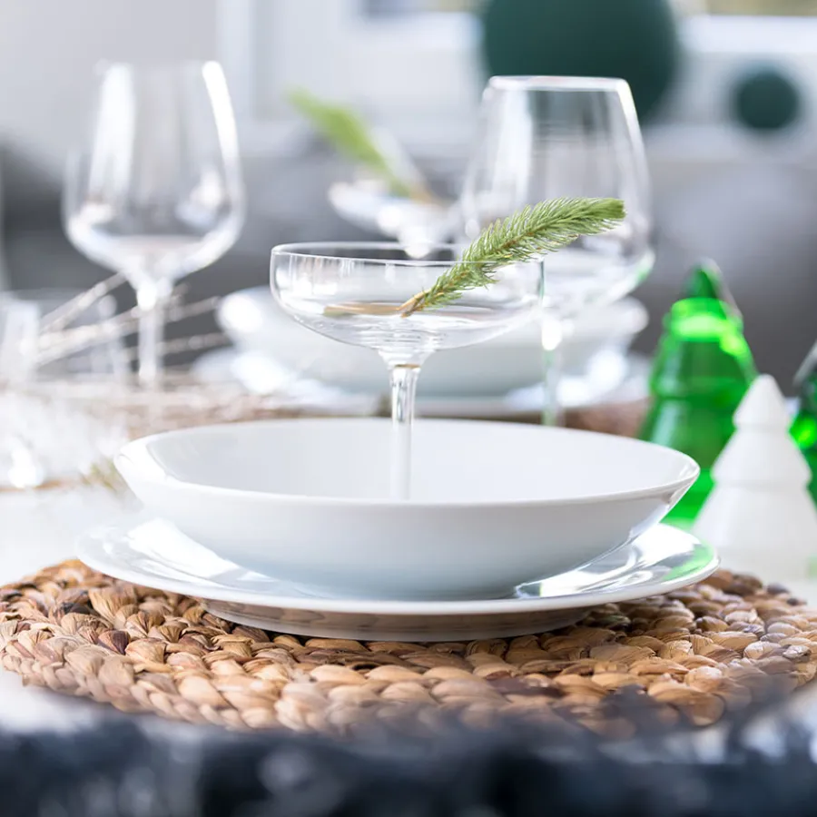 Middagstallerken fra det tidløse serviset Sense. Porsgrunds Porselænsfabrik har utviklet dette servise med alt fra tallerkener til sausenebb i hvitt porselen, som står i stil med et hvert hjem om det er moderne eller mer tradisjonelt. Serviset kan pyntes opp og ned slik at det kan brukes i hverdagen, men også til mer høytidelige anledninger. Tallerkenen kan vaskes i oppvaskmaskin og har en livslang kantskårgaranti.