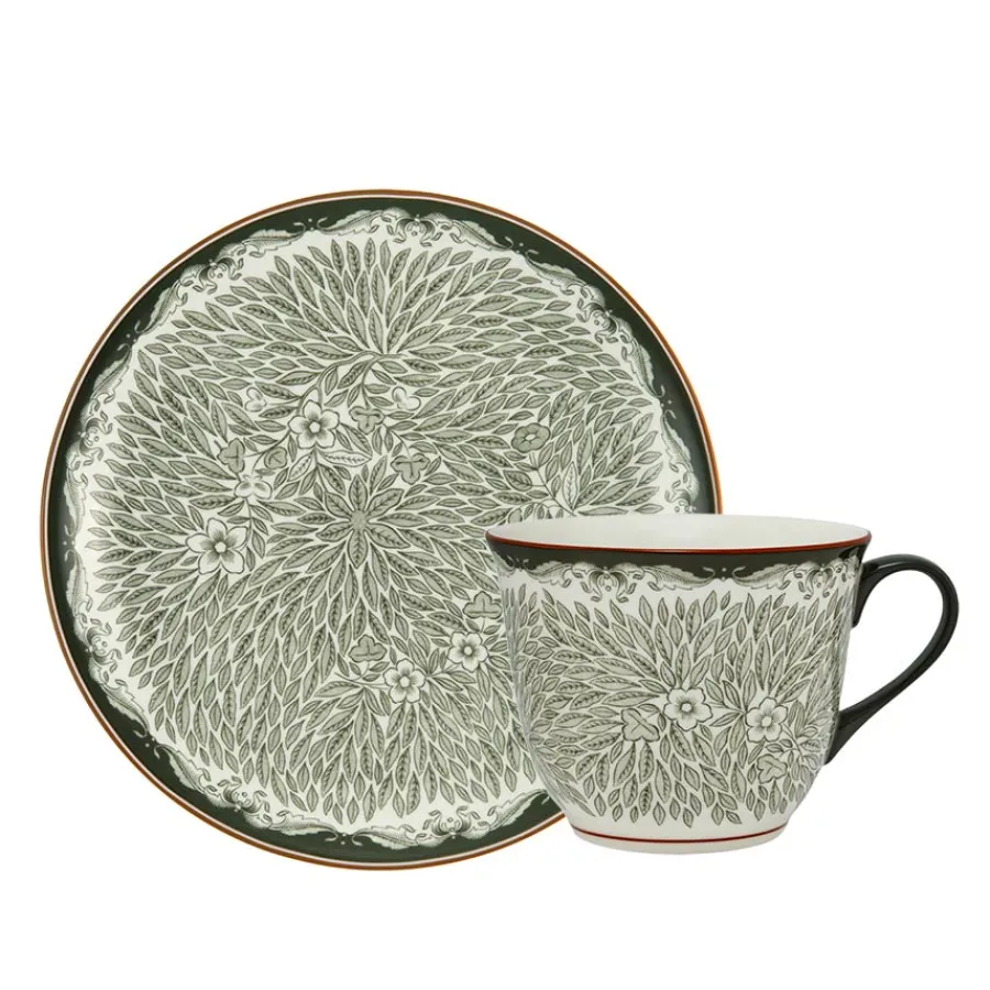 Denne 2-pakningen inneholder et krus på 40 cl og en tallerken på 20 cm, perfekt for frokost eller kaffestunden. Den dype grønne dekoren i Ostindia Floris-serien gir en naturlig og tidløs eleganse til måltidet. Settet er laget av holdbart porselen som tåler både oppvaskmaskin og mikrobølgeovn.