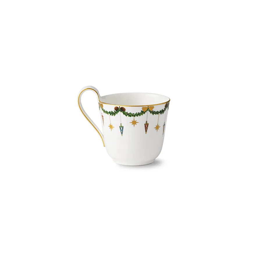 Julekrus fra Royal Copenhagens vakre juleservise Stjerne Riflet Jul. Den fine koppen er pyntet med gulldetaljer og en krans dekorert med julepynt. Juleserviset har for mange familier blitt en del av juletradisjonen og selvskreven gjest ved julemiddagen. Koppen rommer 33 cl og er en allsidig julekopp som kan brukes til både te, kaffe og kakao.